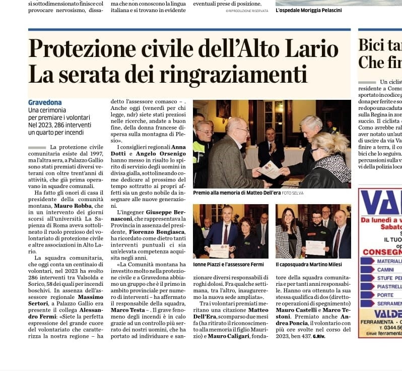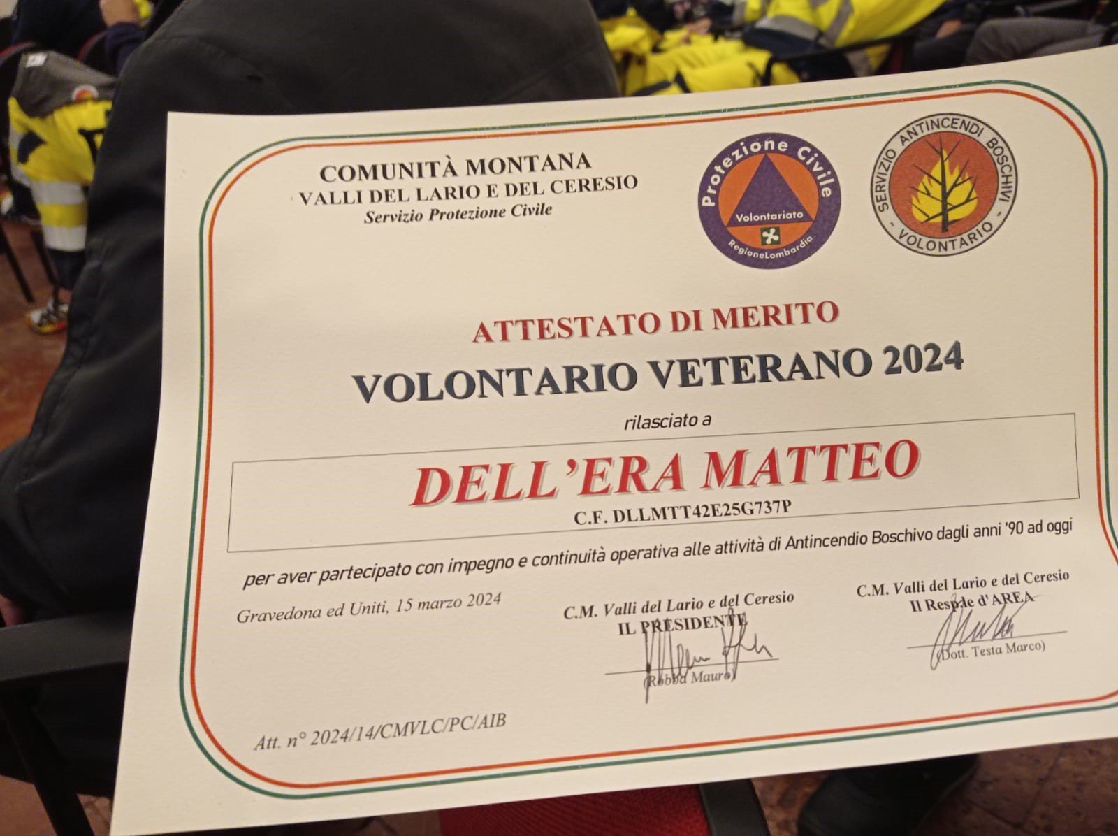 Sono stati premiati diversi Veterani che svolgono attività operative da oltre trent’anni e tra i tanti è stato riconosciuto merito al nostro concittadino Matteo Dell’ Era, scomparso 2 mesi fa, che ha ricoperto il ruolo di Volontario per molti anni.